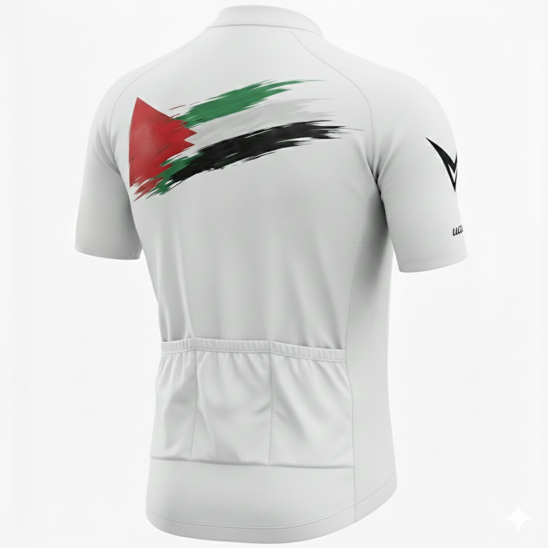 The UAE Strike – White Edition offers the same bold energy in a cleaner, sharper form. A crisp white base amplifies the movement of the flag-inspired brush strokes, giving the jersey a lighter, faster visual identity. Minimal yet expressive, it balances national pride with modern performance design.