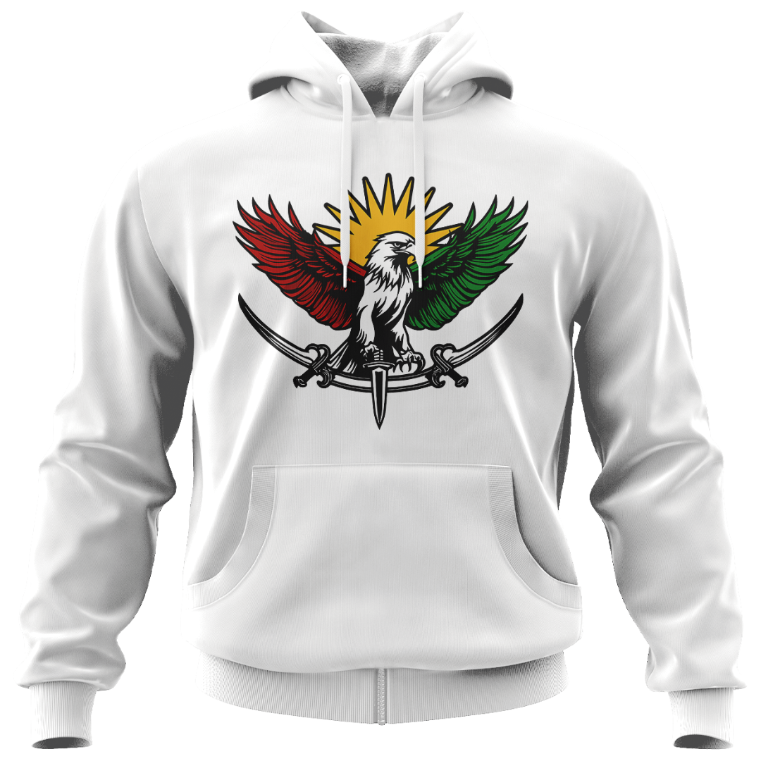 The Bewar Hoodie takes its name from the Kurdish word meaning wanderer or one far from home, and this design carries that spirit with strength and pride. Centered on the chest is a bold eagle, its wings colored in the Kurdish flag’s red, white, green, and yellow. The swords below symbolize courage and resistance. The sunburst behind the eagle represents hope, identity, and the unbreakable connection to the land.