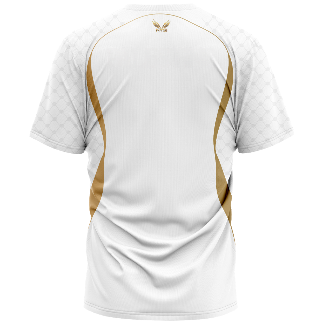 The Palestine Regal Jersey blends elegance with national pride through a clean, premium design inspired by classic football kits. A crisp white base is accented with smooth gold contours that flow along the sides, creating a sleek athletic silhouette that feels both modern and timeless.
