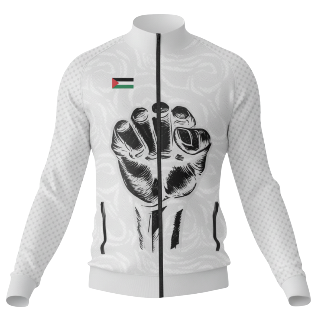 The Palestine Unity V3 brings a powerful, symbolic design centered around strength, resilience, and identity. Set on a clean white base, the jacket features a bold black raised-fist illustration dominating the front — a universal emblem of solidarity and resistance. Behind it, a soft tonal pattern adds depth without distracting from the artwork. The left chest carries a crisp Palestinian flag for a focused, meaningful touch.