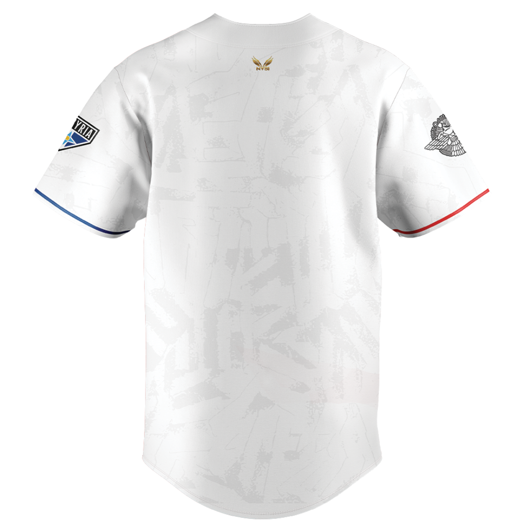 Introducing the Ashur jersey—crafted in white with "Assyria" boldly displayed on the chest and the Assyrian flag on the front. The Assyrian emblem is featured on one sleeve, while "Ashur statue" is proudly displayed on the other. The back of the neck is accented with the Nasi logo, blending cultural pride with sleek style.