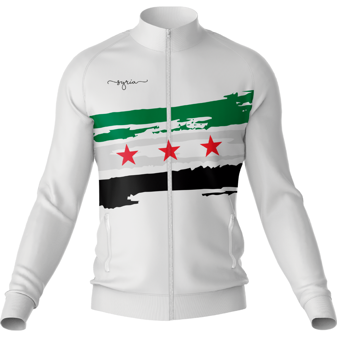 This version is built on a clean white base, giving the historic Syrian independence flag full contrast across the chest in green, white, black, and three red stars. The design feels lighter, sharper, and more open, while still keeping the same strong identity presence. A minimalist “syria” script sits over the heart, keeping the focus on heritage without heavy branding.