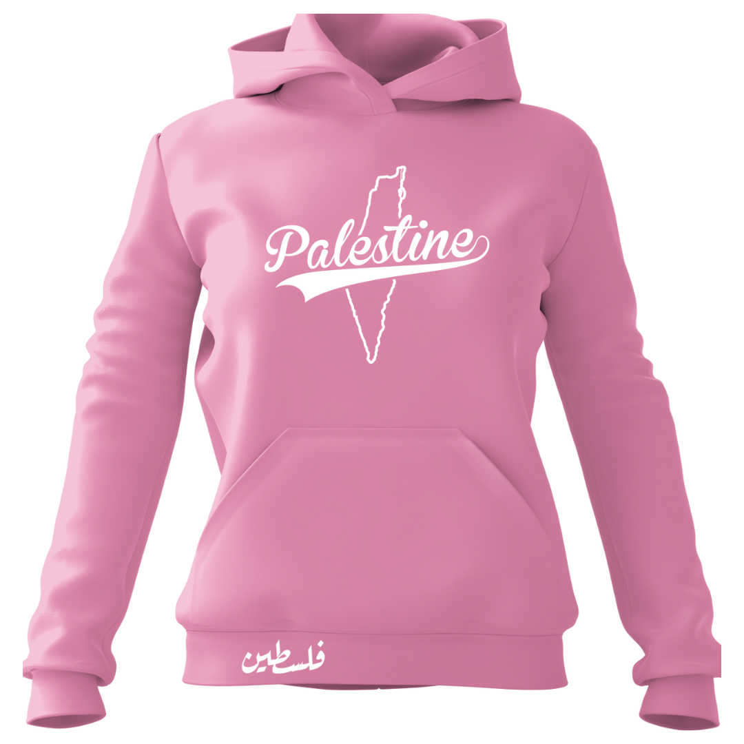Presenting "Hayat," our vibrant pink Palestine-inspired women's hoodie. The front showcases the grace of the Palestinian map's outline in white, complemented by the name "Palestine" in bold white font. At the bottom, elegance reigns with "Palestine" in Arabic, adding a touch of cultural beauty. "Hayat" is more than a hoodie; it's a celebration of life and Palestinian heritage. Embrace the spirit, wear the story.